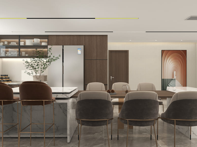 本案新中式风格,以米白深棕为底、金属点睛,在社交、饮食、休憩、品茗空间里,融入中式细节于现代材质,达成传统底蕴与现代舒适的平衡,构建出雅致有文化的居住空间。