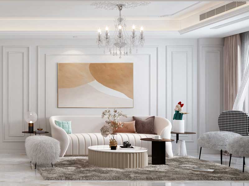客厅以石膏线造型作为基底,简洁的背景墙设计,通过软装配饰营造出温馨柔和的气质,美观精致。