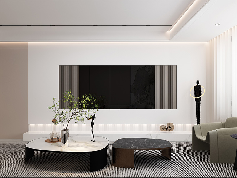 当然,可以在局部点缀不同色彩,也可以融入石膏线条元素、灯饰元素和悬空电视柜元素等,丰富视觉感受。