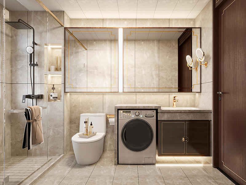 在装修卫生间时,可以考虑将洗手台和洗衣机外置,设计在过道处,这样可以实现干湿分区布局、方便多人同时使用卫生间的不同区域,同时也为卫生间减少空间局促的尴尬。