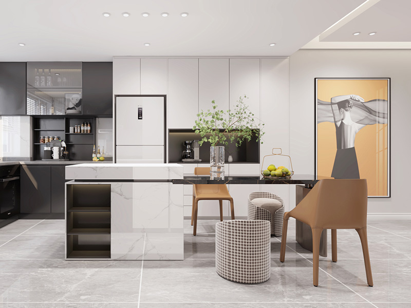 餐厅与厨房做敞开式设计,将餐桌与餐岛相连,增加空间的操作台面、丰富空间储物能力,同时也彰显居室的整洁时尚。