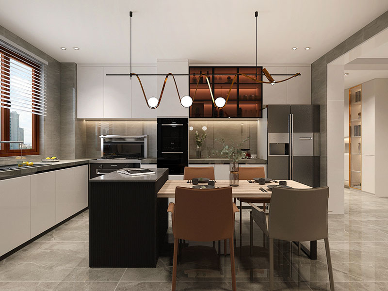 餐厨做开放式布局,结合明窗和光源设计等,彰显空间的宽敞明亮。巧用临窗区域的活动空间,设计储物柜和操作台面,丰富餐厨的实用功能。