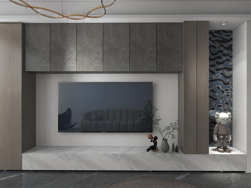 电视背景墙采用部分收纳柜设计,提升空间实用性,不同材质的相互搭配碰撞,视觉上更丰富,气质满满。