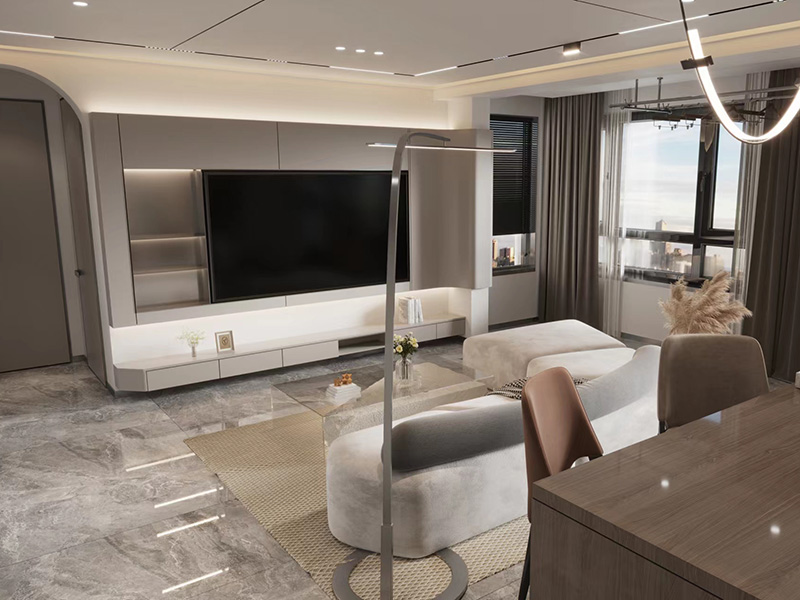 从就餐区望向休闲区,客厅背景墙在彰显居室简洁大气质感的同时,融入收纳设计,丰富居室的储物能力,又保持客厅的整洁有序。