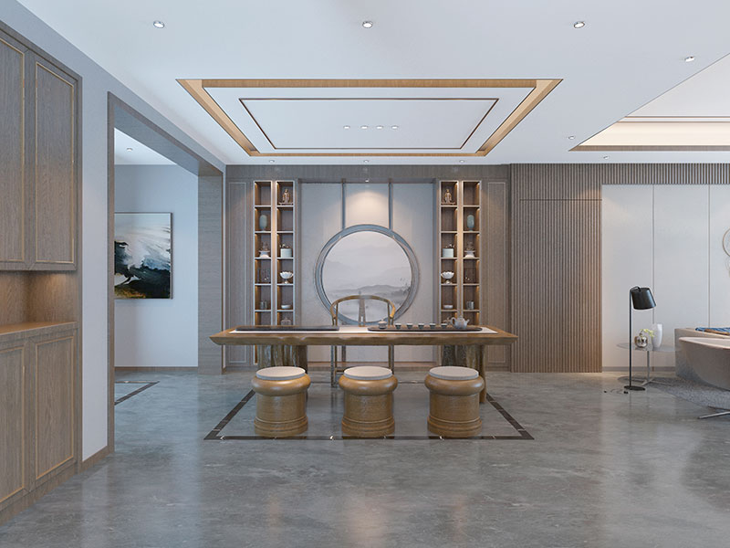 在靠近客厅的过道空间,巧用墙体设计嵌入式多宝阁展柜,与同样材质的茶桌椅形成呼应,为居室空间增添文化气质。