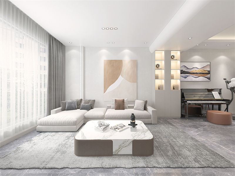 在浅灰色调装饰布局的客厅空间,融入简洁时尚的家具、软饰,并结合无主灯设计等,诠释悠然惬意的生活状态。