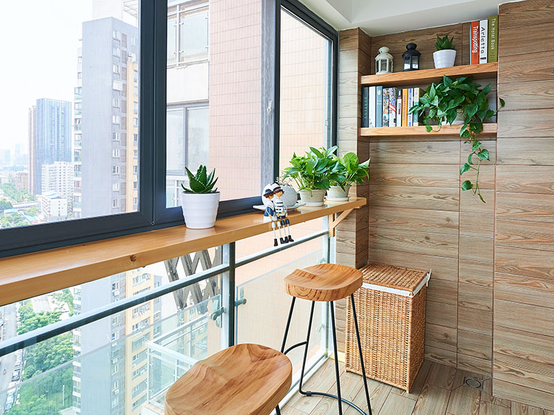 也可以靠近阳台窗框设计悬空台面,摆放高脚凳,搭配绿植和书籍等,呈现敞开式布局的咖啡角。
