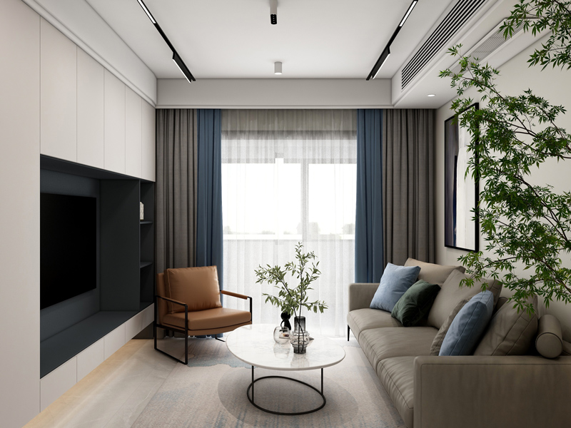 客厅采用无主灯设计简洁大气,背景墙布局整面收纳柜,满足区域收纳需求,增添绿植,为空间带来一份清新。