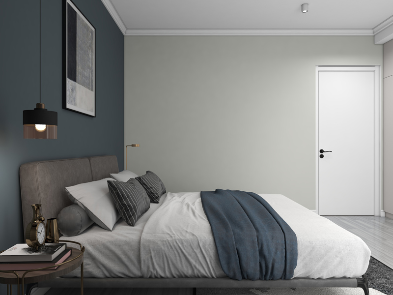 主卧采用撞色设计墙面丰富空间层次感,简洁的设计搭配精致装饰摆件,提升精致感,营造出品质的睡眠氛围。