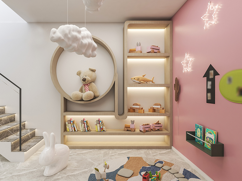 可以考虑对长过道进行改造设计,融入上墙式洞洞板、画板,搭配收纳架、爬爬垫等等,给孩子打造一个可以肆意玩耍的儿童娱乐区。