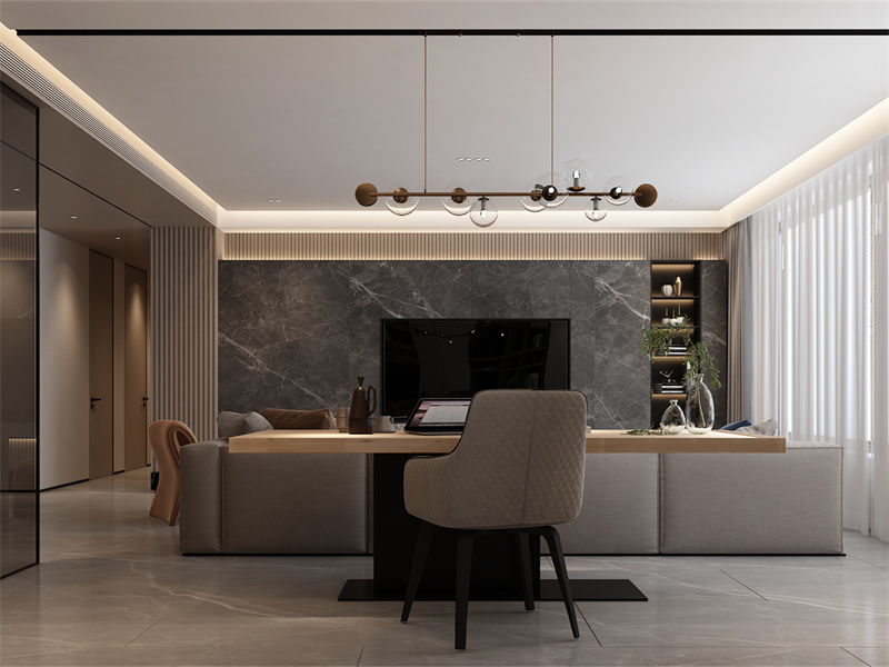 于沙发墙融入储物设计,呈现满墙式书柜,并搭配简洁时尚的书桌椅,在客厅空间呈现开放式书房,满足居家工作等功能需求。