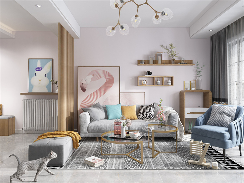 本案是百平米刚需户型,基于北欧风格的家居设计理念,巧用简单的线条和色块装饰点缀居室空间,营造一种宁静淡雅的生活氛围感。