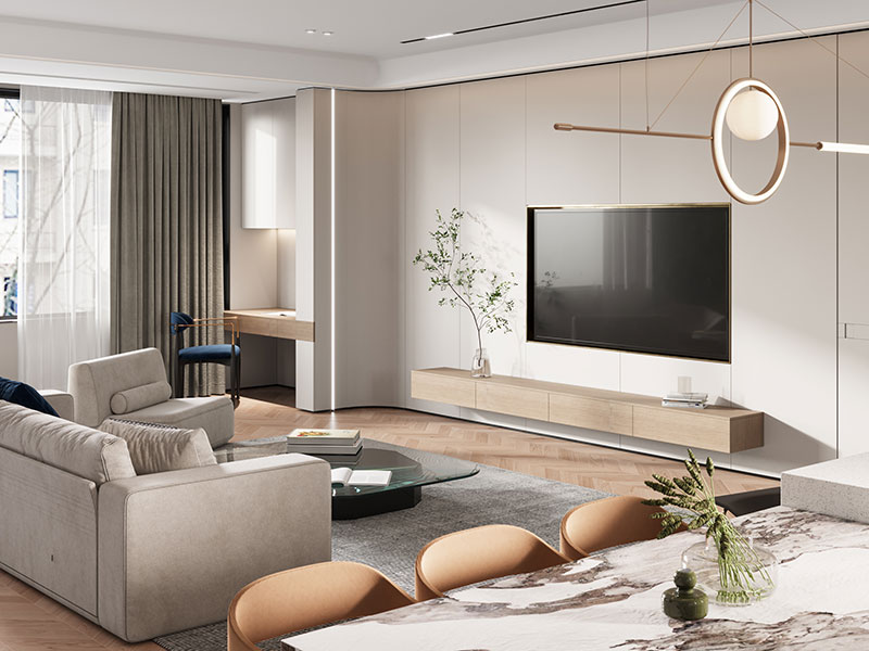融合轻奢细节,通过浅木、低饱和色系与质感材质的搭配,奠定柔和松弛的空间基调。