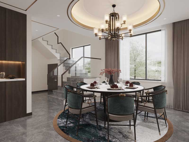 新中式设计风格,圆形餐桌搭配深绿座椅,创意和谐,圆形吊顶与餐桌上下呼应,营造团圆就餐氛围。