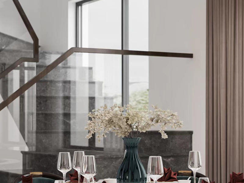 深色大理石楼梯搭配玻璃扶手尽显精致,现代感十足,为空间增添自然美感,呈现时尚优雅的用餐氛围。
