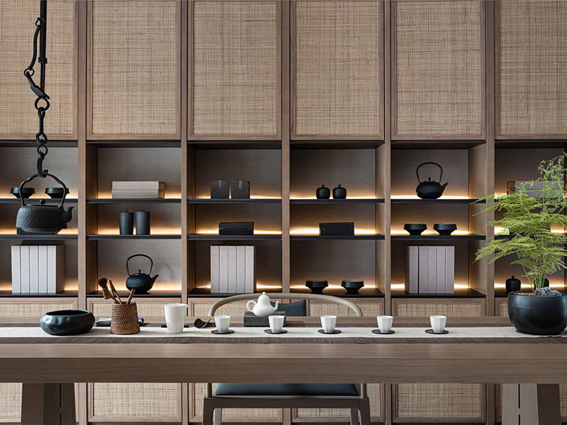 茶台长案、满墙式茶架、丰富的茶具,点缀盆栽绿植和光影等,营造一个品茶和放空的精神之所。
