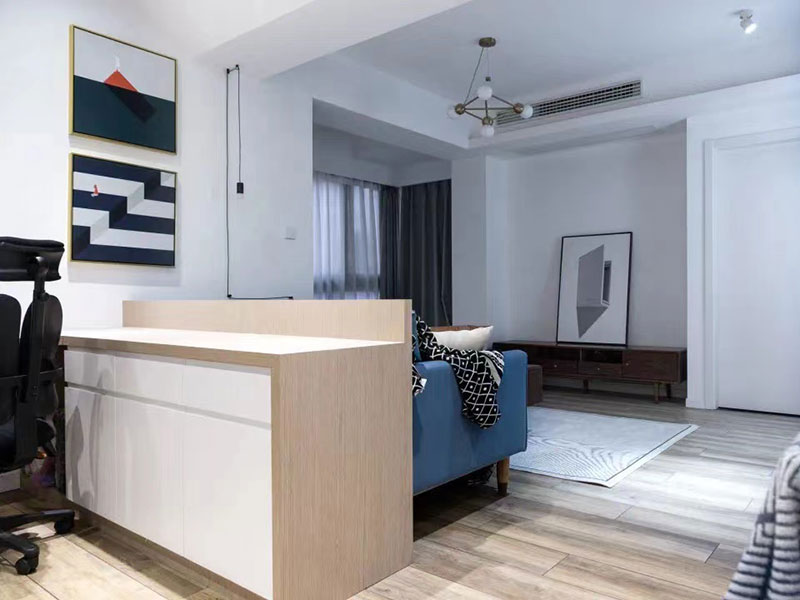 以半高的定制柜为客厅与书房的隔断,既明确了功能区域的划分,又让沙发也有了依靠,呈现多功能客厅。