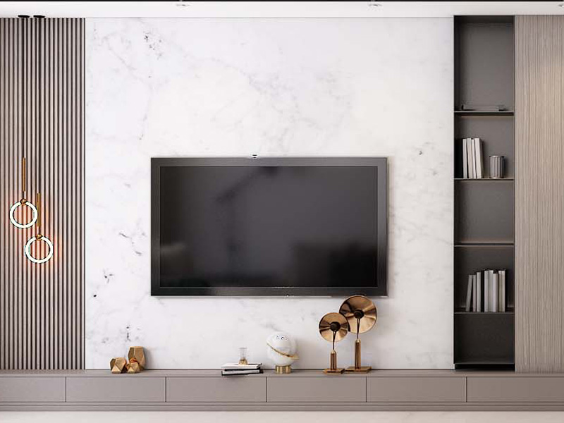 巧用石材与木材的结合,呈现彰显简洁时尚质感,同时又不失储物等实用功能的电视墙设计,诠释现代风格。