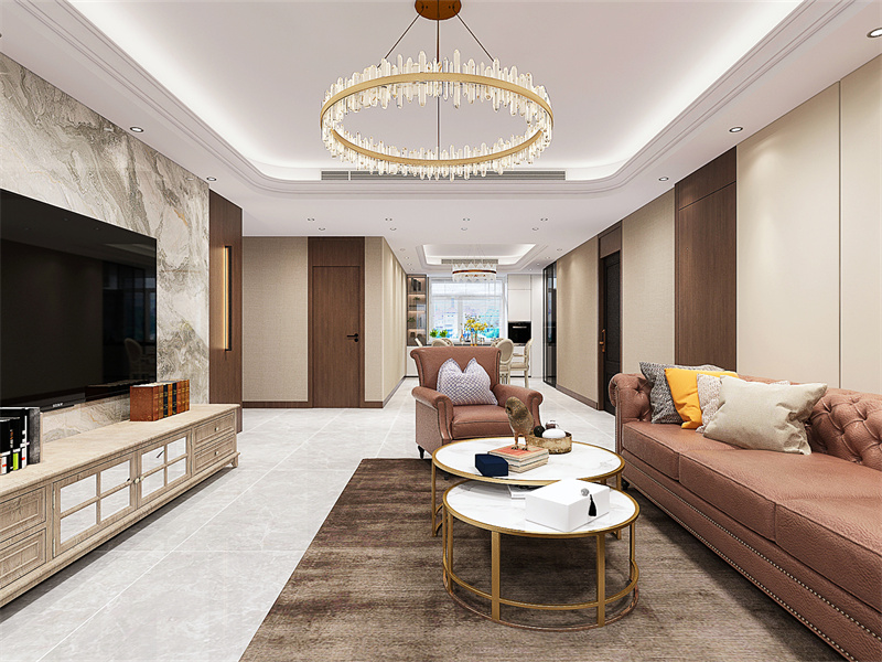 大理石电视墙纹理独特,与木色元素结合,刚柔并济。棕色系家具搭配金色金属边茶几,质感十足。地毯划分区域,空间宽敞,满足休闲娱乐、观影等多种居家生活场景。
