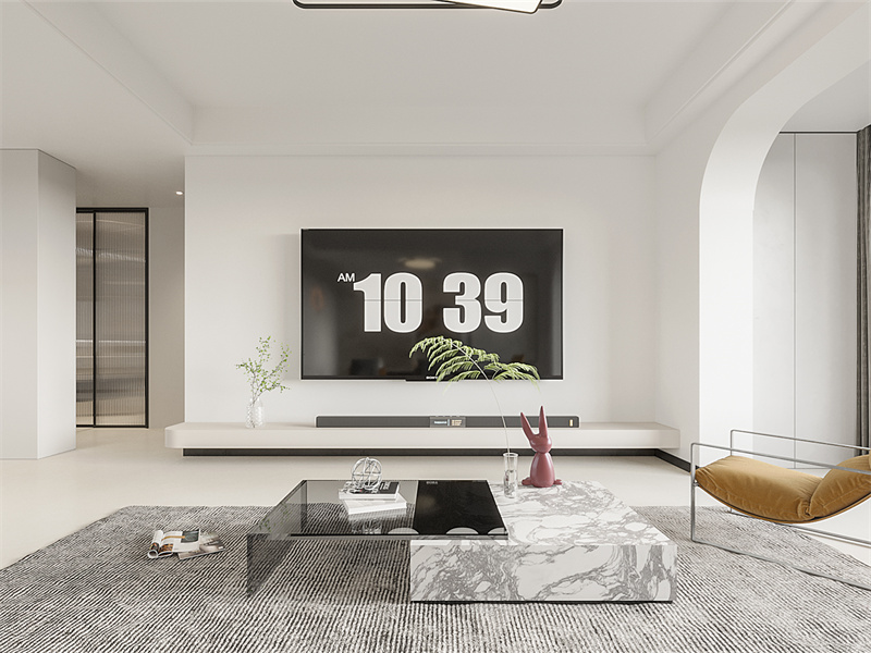 本案遵循简约风格的设计理念,营造出简洁舒适且富有质感的居住氛围。主色调采用纯净的白,搭配灰色、黑色等中性色,局部以浅绿色、浅黄色、橙色等亮色点缀,增添活力。