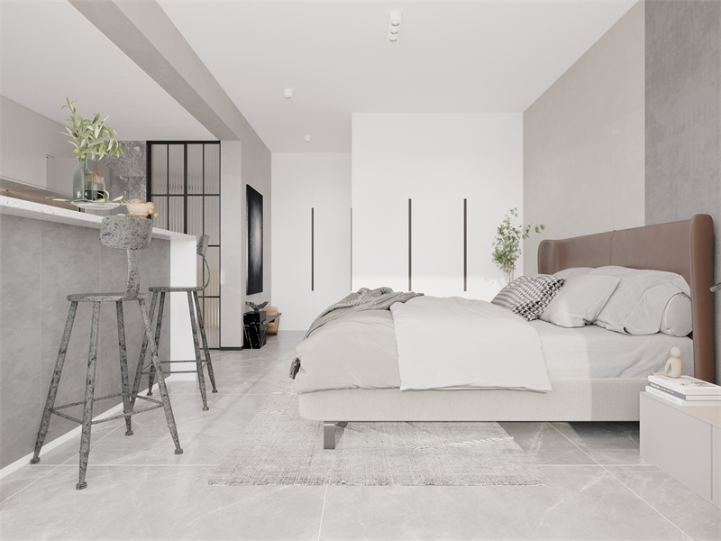 设计注重简洁实用,灰白墙面搭配棕色床头背景,营造温馨宁静氛围。无主灯设计结合局部照明,满足不同场景需求。
