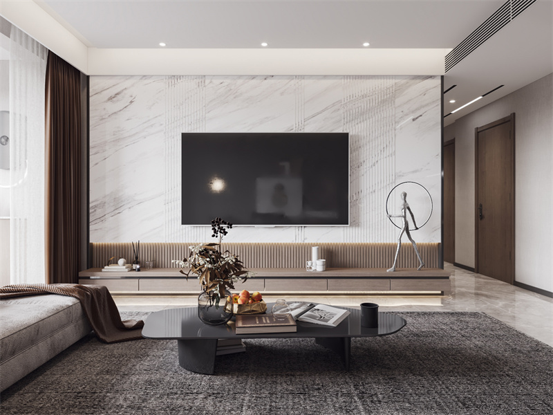 摒弃了繁杂的造型装饰,背景墙设计巧用大理石和木质格栅形成的鲜明视觉对比,展现出极简生活美学。