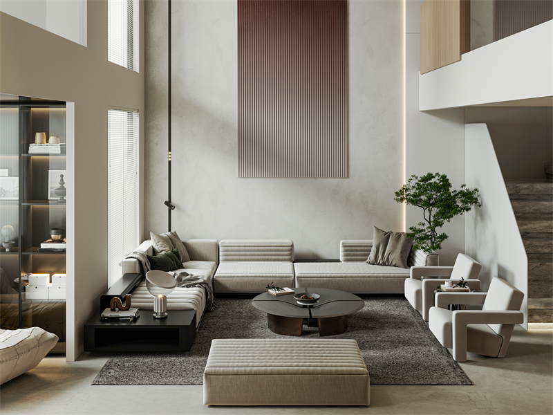 挑高空间搭配简约沙发,尽显大气风范,深灰色茶几与地毯相呼应,更显稳重,绿植提升区域氧气感。