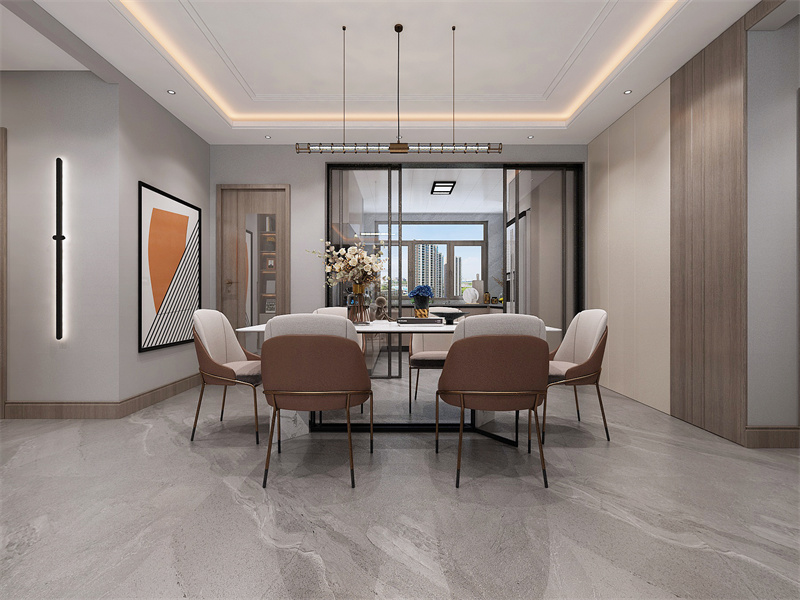 开放式布局在空间内,动线便捷合理,色调柔和,简约吊灯与艺术挂画增添格调,打造出富有品味的用餐环境。