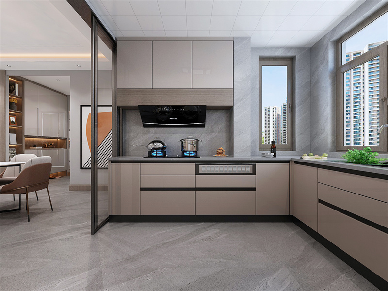 厨房设计现代实用,简洁橱柜搭配灰色大理石墙面,提升区域品质感,电器嵌入其中,节省空间,整体更和谐。