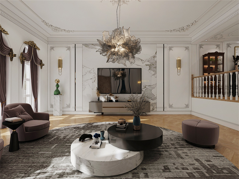 法式风格客厅以经典白为主色调,搭配深绿与棕褐点缀,营造出高雅格调。沙发、座椅造型圆润优雅,围合布局促进交流。大型艺术吊灯华丽却不失温馨,地毯图案增添艺术感。