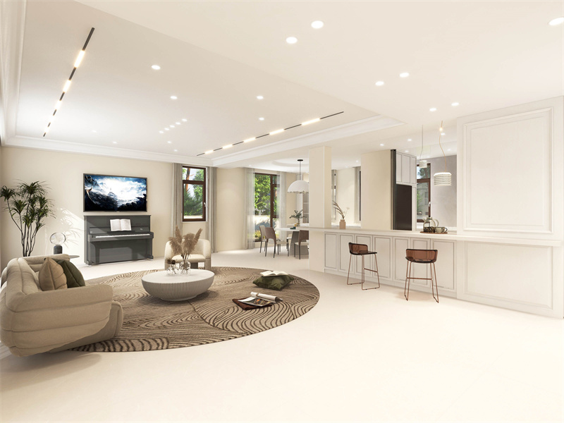 以奶白色为主调,搭配浅卡其色沙发,柔和温暖。拱形门洞与弧形元素增添浪漫氛围,大窗户引入充足自然光,让空间更加明亮通透。