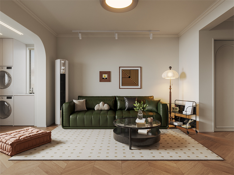 区域走复古松弛路线,圆形茶几、波点地毯丰富层次,墨绿色皮质沙发搭配几何挂画,营造怀旧氛围。