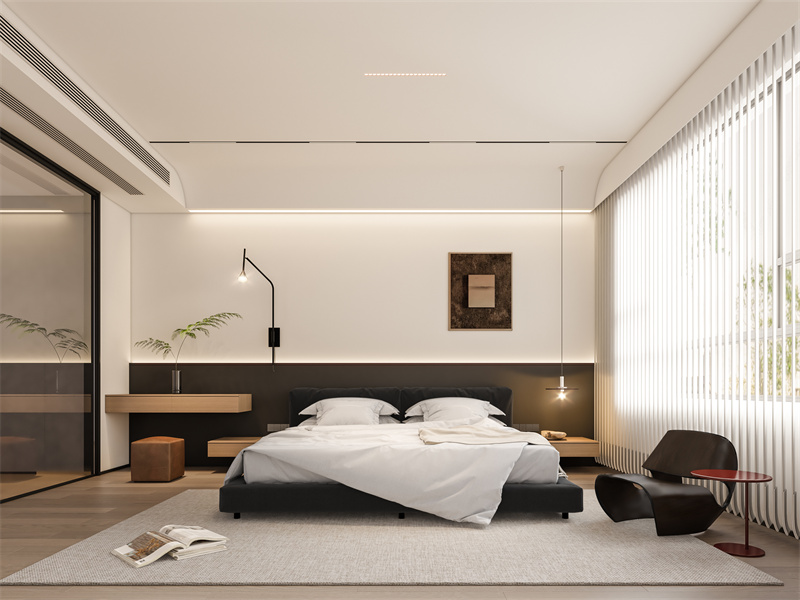 遵循静谧治愈逻辑,浅墙、木色与深灰床头形成对比,悬浮灯、简约挂画强化现代感。无主灯设计借间接光营造柔和氛围,玻璃移门拓展空间延伸感,构建兼具私密性与舒适感的休憩环境。