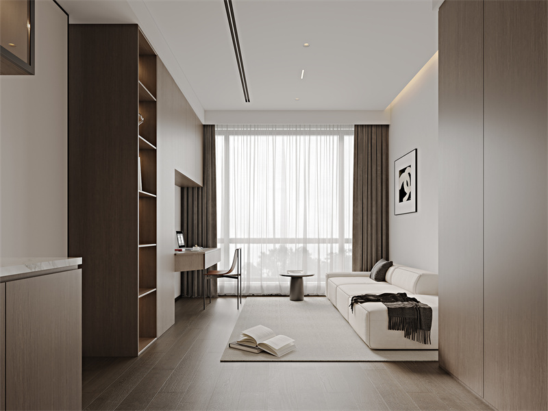 围绕复合实用设计,一体化柜体融合收纳、办公功能,浅棕与米白配色温润柔和。无主灯设计借线性光营造专注氛围,沙发、小圆几拓展休憩场景,展现小空间合理利用的设计巧思。