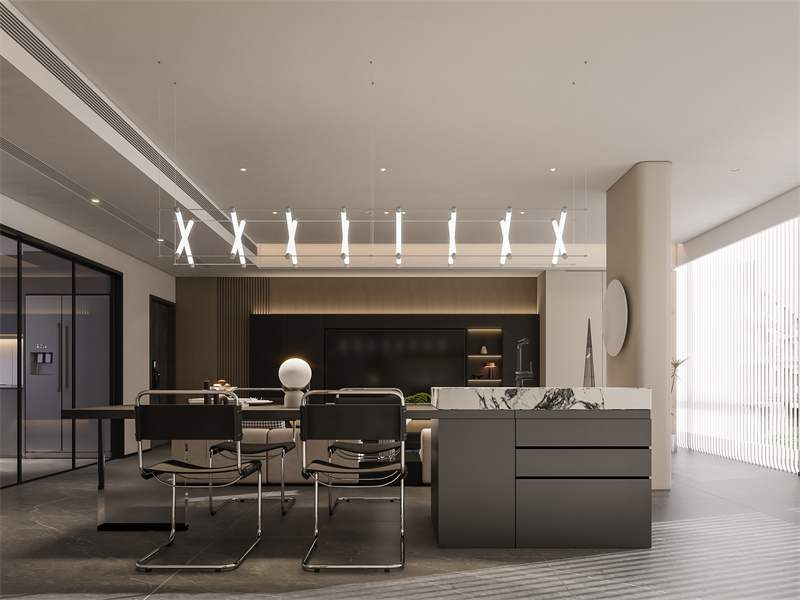线性吊灯成为视觉焦点,深灰中岛台与浅棕墙面碰撞,展现材质张力。开放式布局强化空间联动,极简餐椅、艺术摆件注入现代感,塑造“社交型餐厨”的理想用餐环境。