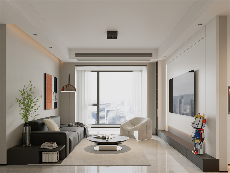 客厅空间沙发、茶几布局合理,形成舒适交流区。大窗引入充足采光,以灰白为主色调,搭配绿植、艺术画,简约又不失生机。悬浮电视墙时尚大气,潮玩摆件增添趣味。
