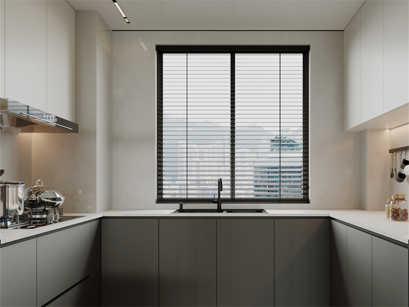 厨房空间设计紧凑实用,U型布局合理利用角落。水槽正对大窗,光线充足,操作动线流畅,满足日常烹饪需求,色彩以灰白为主,简约干净,营造出宁静氛围。
