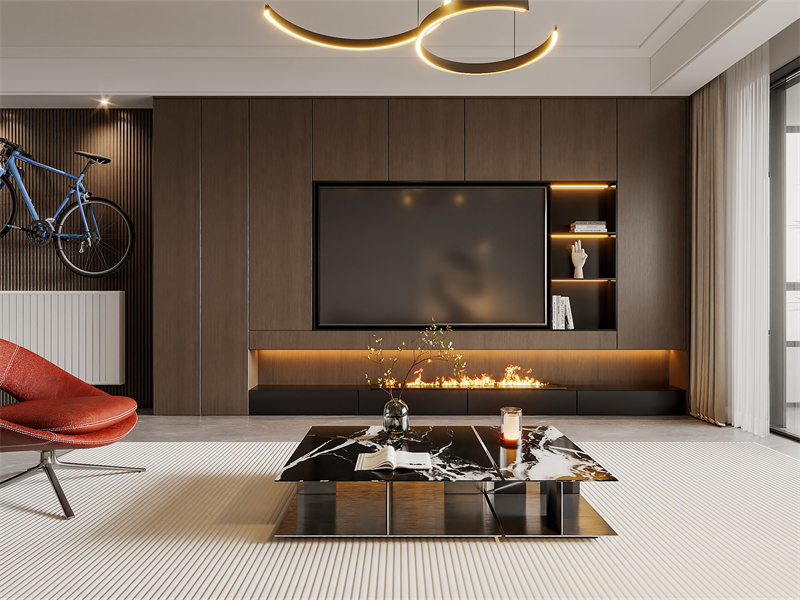 采用深木色与亮色家具碰撞,营造出现代且富有活力的氛围。独特造型的吊灯成为视觉焦点,大理石纹理茶几与壁炉设计,提升了空间的奢华感与温暖感,墙面的收纳与展示区域,让空间兼具实用与美观。