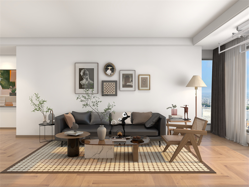 白墙为底,艺术画错落构建视觉层次。深灰沙发搭配棕调抱枕,木质边几与藤编单椅碰撞材质温度。低饱和色调中,混搭材质承载日常松弛,让会客与独处皆享舒适。