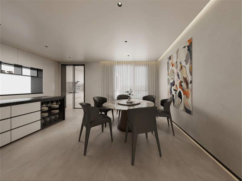 餐厅采用中性色调,白色墙面与浅灰色地砖相衬,简约干净。圆形大理石餐桌搭配黑色餐椅,增添时尚感。一旁的餐边柜“藏露结合”,满足收纳与展示需求。墙上色彩明快的抽象画,为用餐空间注入艺术气息,让每次用餐都充满仪式感。