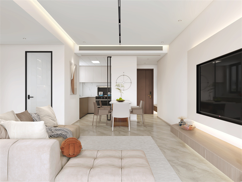 浅色调与木质元素结合,营造出明亮温馨的氛围。柔软的沙发组合与个性装饰,打造出放松的会客环境,大尺寸电视与简洁的柜体设计,实用且具现代感。