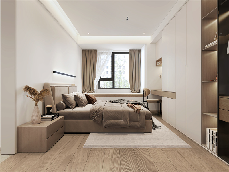 浅棕色调搭配,营造出静谧舒适的休憩氛围。简洁的床头设计搭配柔和床品,舒适感十足,窗边的小书桌兼具实用与休闲功能,充足的柜体满足收纳需求。