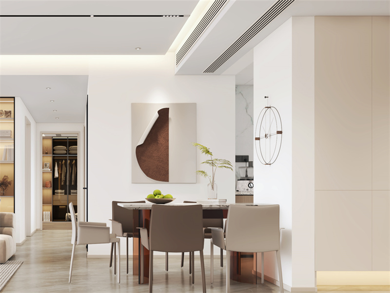 餐桌与餐椅组合实用且具设计感,开放式布局增强了空间的互动性,一旁的收纳区域满足物品存放需求,整体打造出舒适的用餐与社交区域。