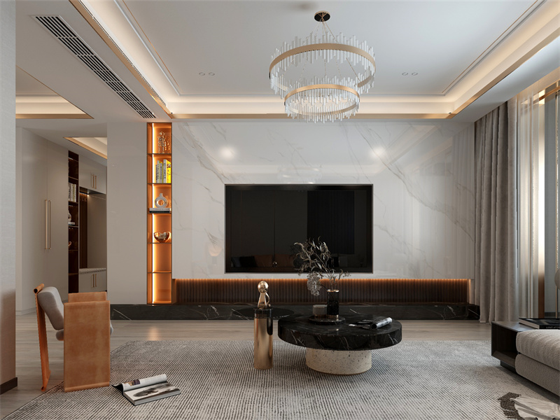 以灰白为主色调,搭配木色元素与少量亮色点缀,营造出简洁明亮又不失温馨的氛围。大理石电视背景墙搭配简约造型的沙发,时尚大气。开放式书架既实用又具展示性,无主灯设计结合局部照明,适配休闲娱乐、亲友相聚等多种居家场景。