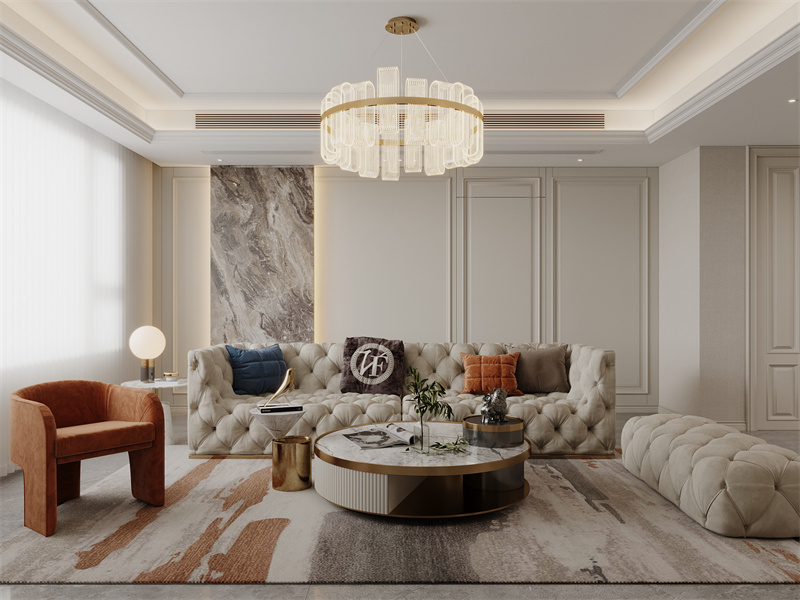 本案采用简约美式风格,以暖棕、米白为核心主色调,融合复古实木家具与现代简约线条,棉麻、实木等自然材质贯穿空间,打造出温馨惬意且兼具雅致感的居家生活场景。