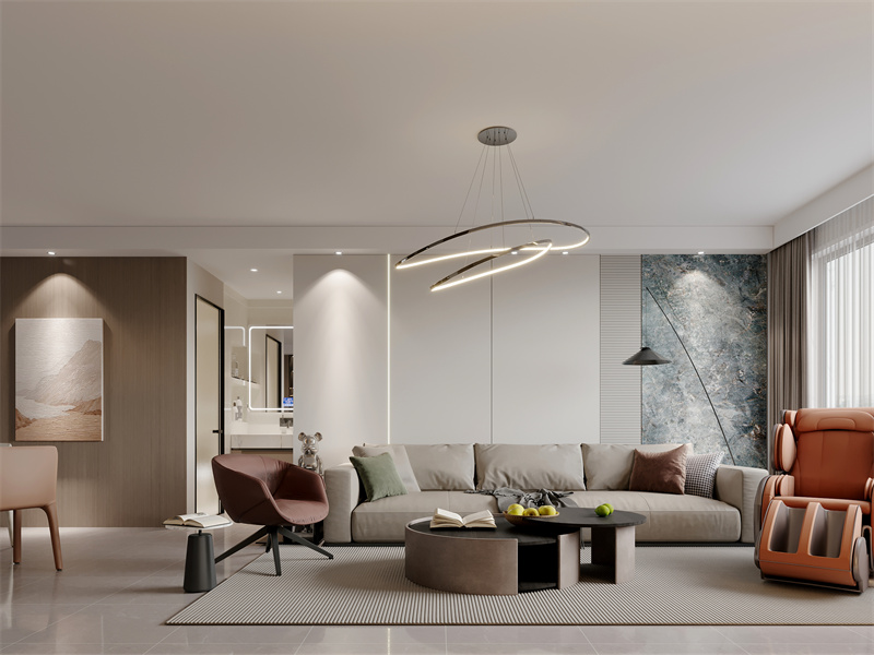 木色、暖棕与灰白构建出温馨现代感,悬浮柜体带暖光兼具展示与收纳,艺术感吊灯与个性单椅提升空间格调。家人休闲观影、待客时,开阔布局与质感软装交融,传递出松弛惬意的互动氛围,适配多元居家场景。