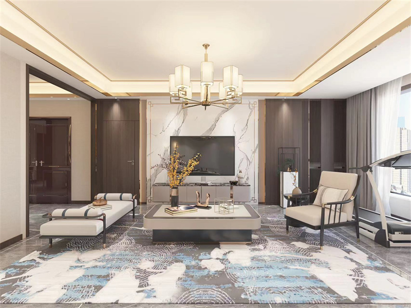 米白大理石与深棕家具碰撞,金属线条、山水装饰呼应。日常社交时,中性色调传递雅致,红棕软装点缀活力,适配家庭聚会、品茗闲谈,于现代材质中注入中式文化,营造大气格调的互动场。
